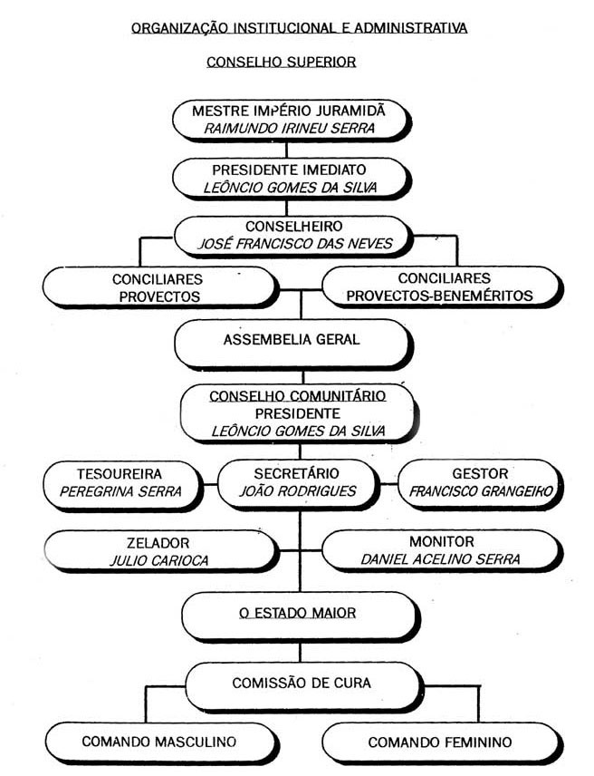 Zelador - Júlio Chaves Carioca. A estes membros, como o próprio Mestre Irineu delegou em vida, eram reservados o direito de administrar, ensinar uma filosofia doutrinária estabelecida e pronta. Fica claro nessa linha administrativa organizada pelo Mestre Irineu, a definição de dois planos: O superior e o comunitário. - SUPERIOR: representado pelo Mestre Império Juramidã, o Mestre Imediato e o Conselheiro; - COMUNITÁRIO: representado pelo Conselho Administrativo coordenado pela ação de um presidente. Ficava pautada mesmo com sua passagem para os planos espirituais, a sintonia entre o material e o astral - que foi uma constante nos 79 anos de vida do Mestre Irineu com sua professora espiritual Clara. Agora ele era o eterno professor que haveria de enviar suas mensagens e ordens espirituais do plano astral. São palavras suas: "O professor é o Daime e o livro é a palavra do Mestre" relatou o sr. Valcírio Genésio. "Tenho certeza no Divino Pai Eterno que eu fazendo uma curta viagem, fico atendendo vocês da mesma forma ou melhor ainda. Qualquer coisa vocês se reúnam, se unam, tomem Daime e me chamem. Pois aí eu estarei", relatou Luiz Mendes. A união, portanto, era a palavra chave da filosofia do grande Mestre, que passava a exercer total influência na vida comunitária e espiritual do grupo. Ainda com referência a organização de seus trabalhos, observemos os organogramas a seguir: